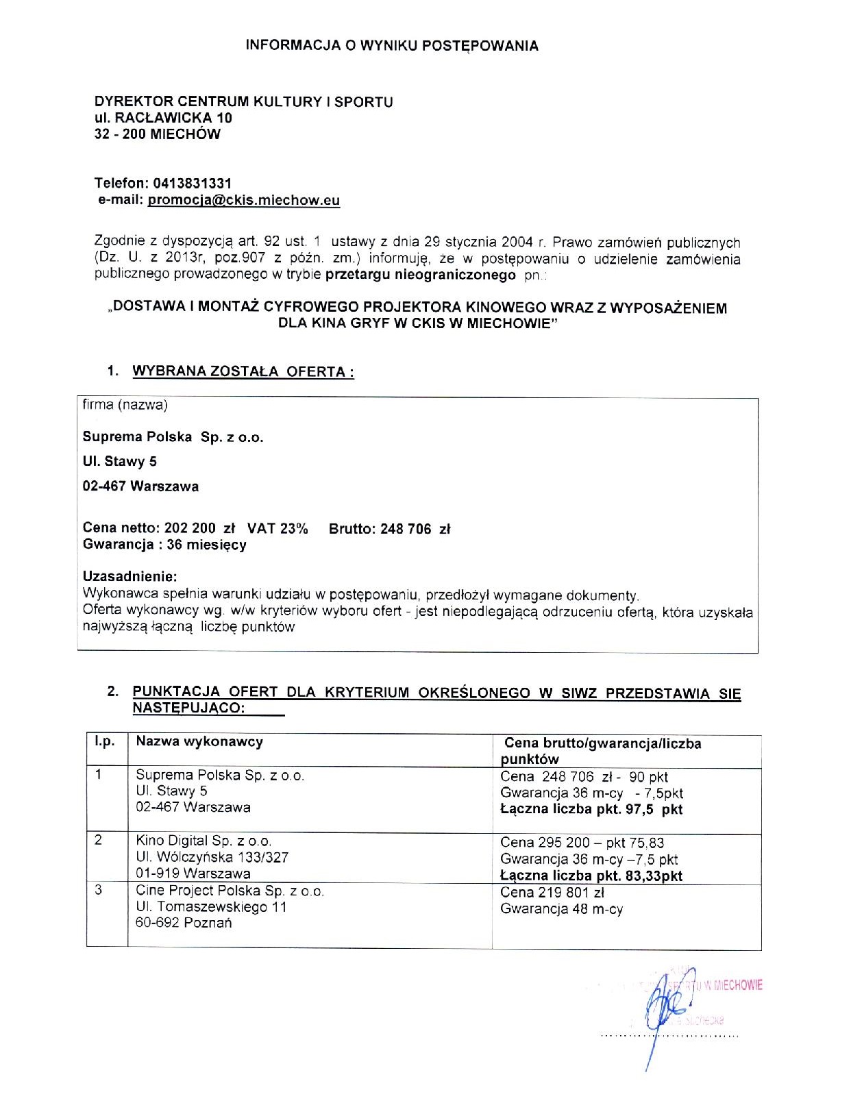 Informacja o wyniku postępowania przetargu nieograniczonego