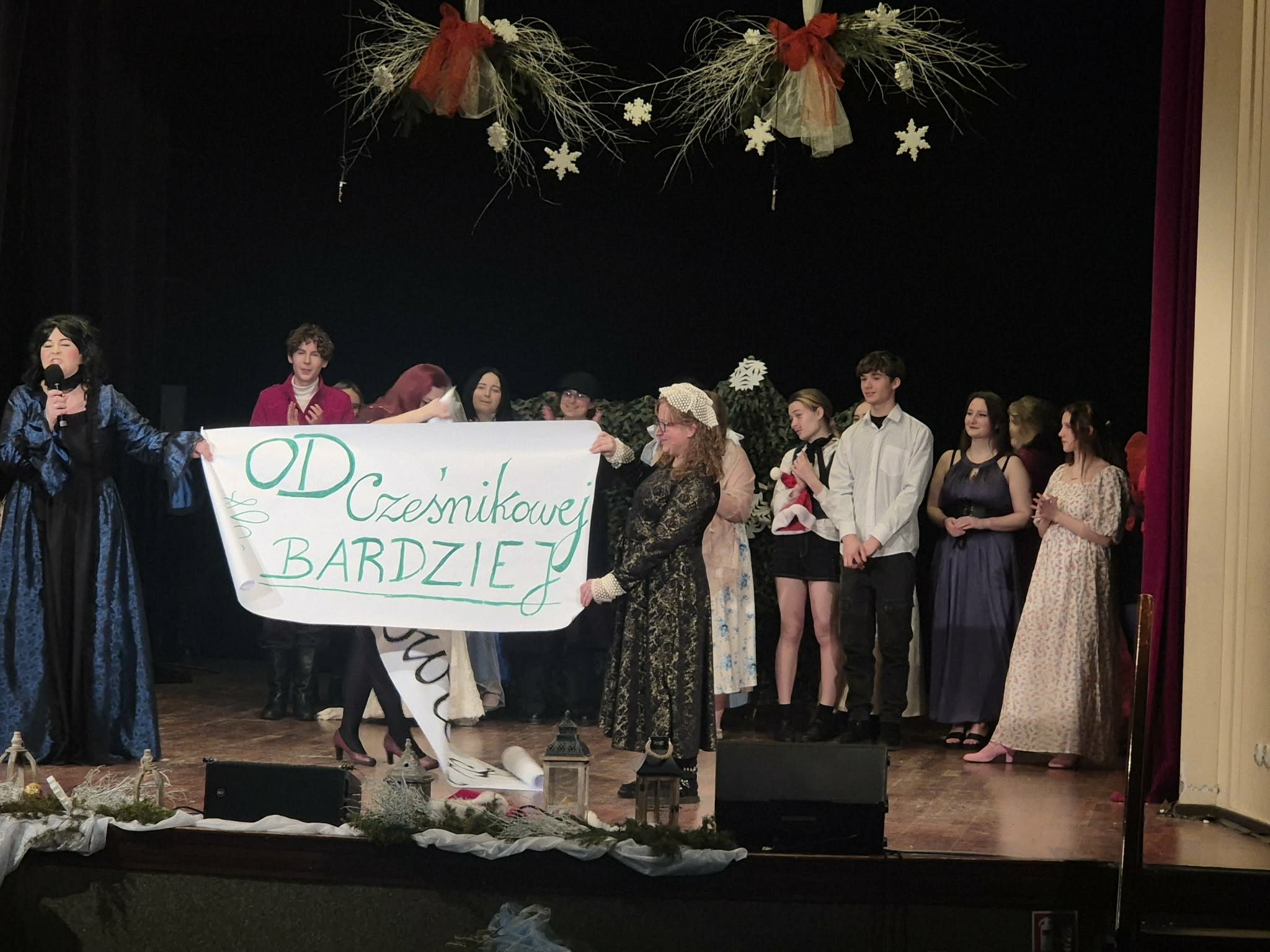 O godzinie 17.00 na scenie Domu Kultury w Miechowie zaprezentowany został spektakl „Opowieść wigilijna” w wykonaniu uczestników warsztatów teatralnych ze szkół: SP 1 Miechów, SP 2 Miechów, SP Pojałowice oraz SP Bukowska Wola. Młodzi aktorzy z dużym zaangażowaniem wcielili się w swoje role. Przedstawienie spotkało się z bardzo ciepłym odbiorem i gromkimi brawami.