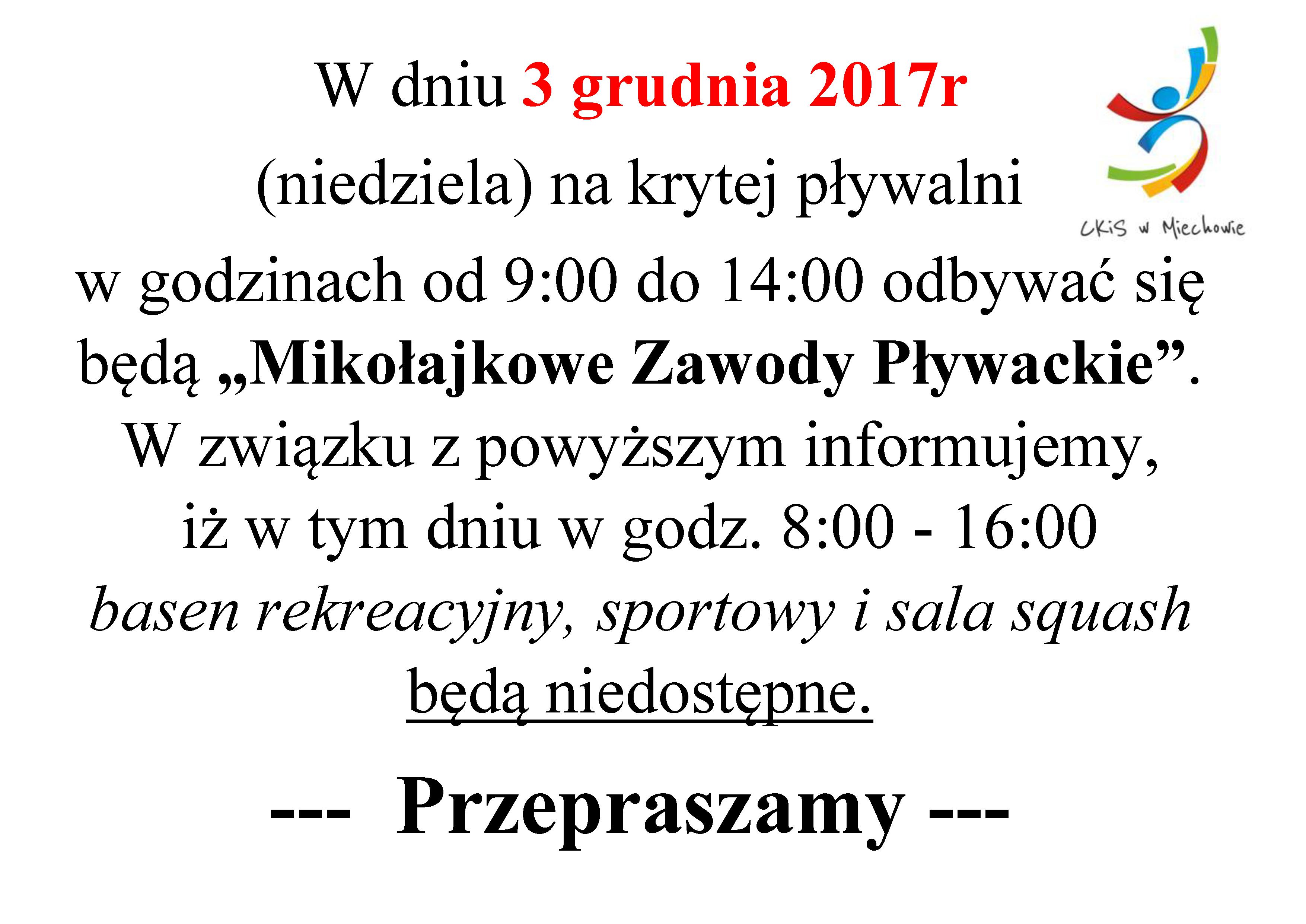 Dostępność pływalni w dniu 3 grudnia