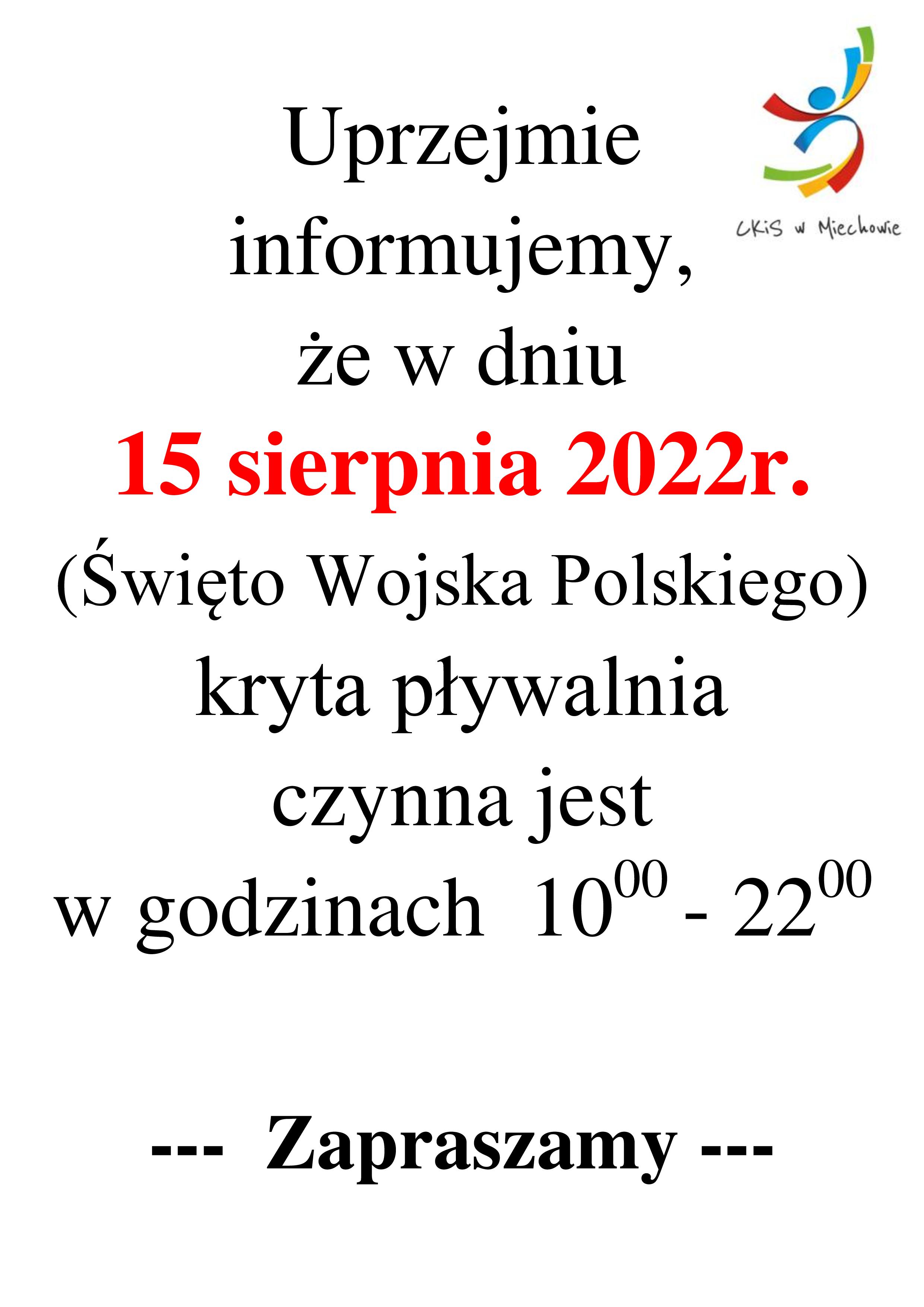 Godziny otwarcia pływalni.